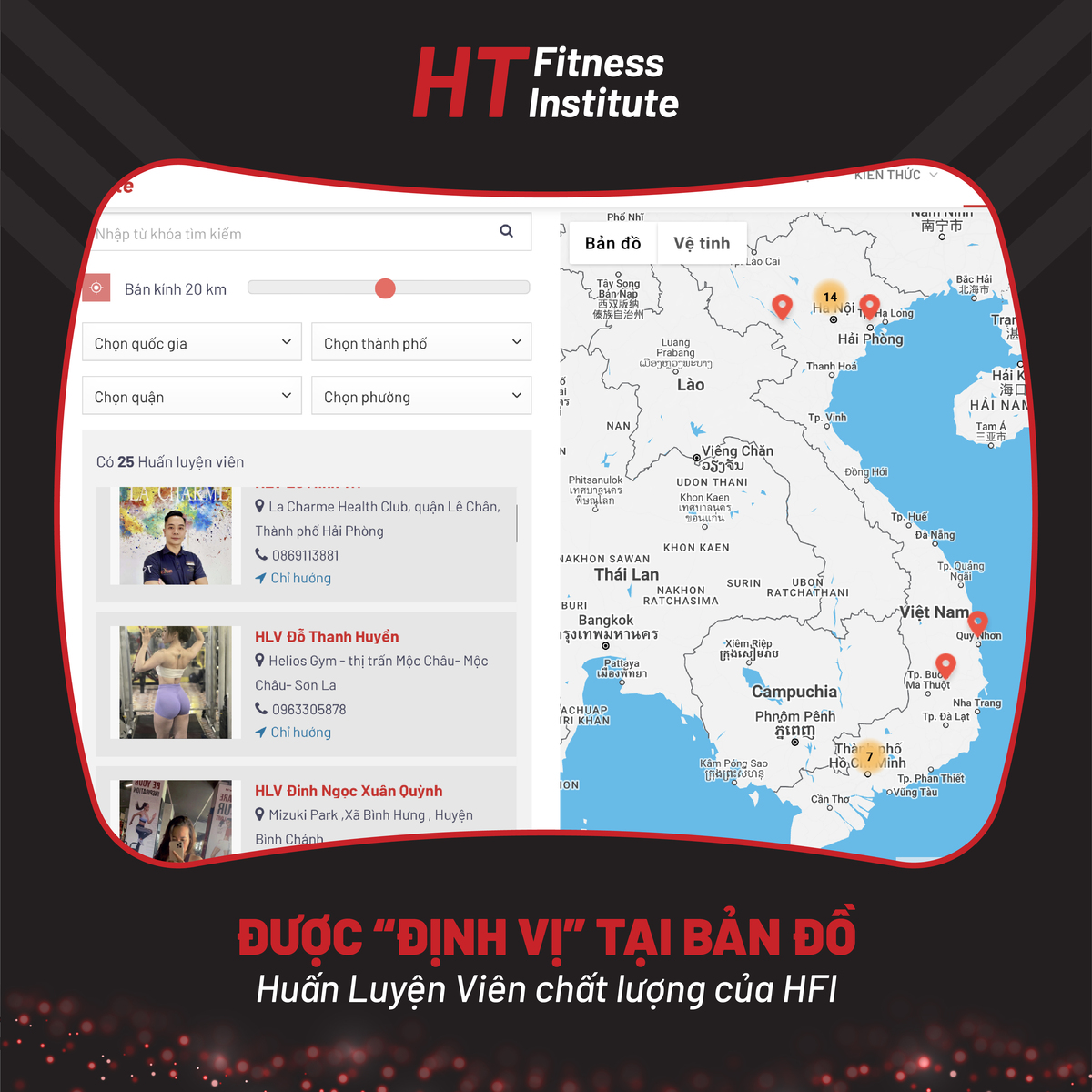 Đây là tính năng mới nhất vừa được cập nhật tại website chính thức của HFI. Bản đồ sẽ định vị vị trí chính xác cùng thông tin đầy đủ của các HLV từng tham gia khóa học tại HFI, từ đó giúp khách hàng, những follower của HFI là người tập luyện phổ thông dễ dàng tìm kiếm HLV phù hợp, được đảm bảo chất lượng chuyên môn.